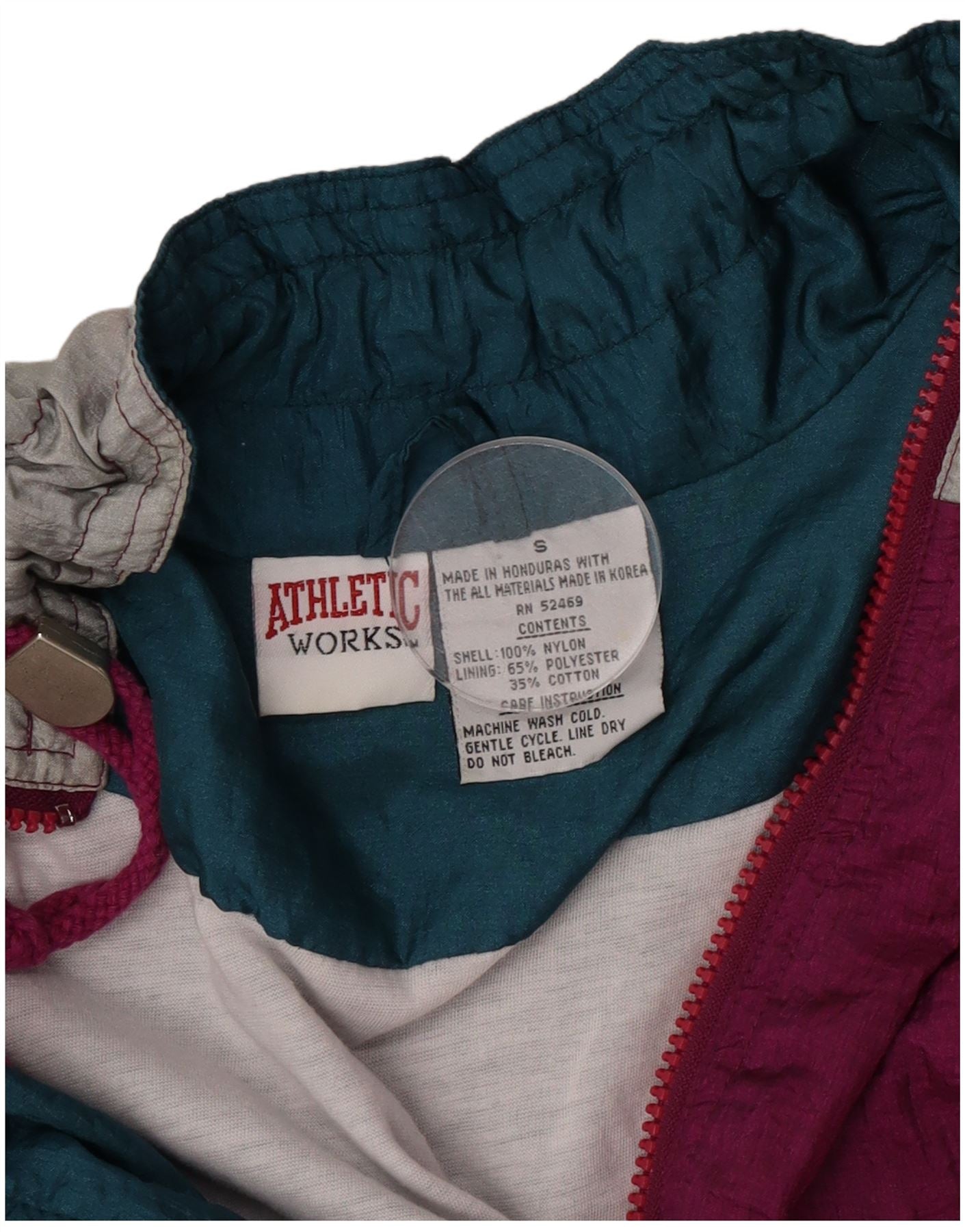 - AI beskrivelse: Træd ud i retrostil med denne vintage Athletic Works activewear-jakke. Den er designet til en afslappet pasform og har et slående farveblokmønster i blågrøn og lilla, fremhævet af et subtilt logo. Den lette nylonskal er perfekt til lagdeling, mens polyester-bomuldsforet sikrer komfort. Med en klassisk halsudskæring og fuld lynlås foran kombinerer denne jakke sporty æstetik med hverdagsbrugbarhed. De elastiske manchetter og søm giver en sikker pasform, hvilket gør den til en alsidig tilføjelse til enhver afslappet garderobe. Omfavn de nostalgiske vibes med dette unikke stykke.