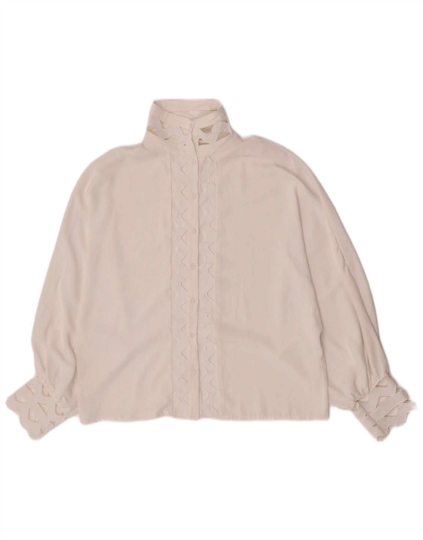 - AI beskrivelse: Denne Vincenove dameblusetop er lavet af glat, råhvid vævet polyester. Den har en høj hals med et karakteristisk kravedesign. Lange ærmer afsluttes med elegante manchetter. Den forreste stolpe og manchetterne viser et delikat geometrisk øjemønster. En knaplukning sikrer fronten. Den almindelige pasform giver en behagelig silhuet.