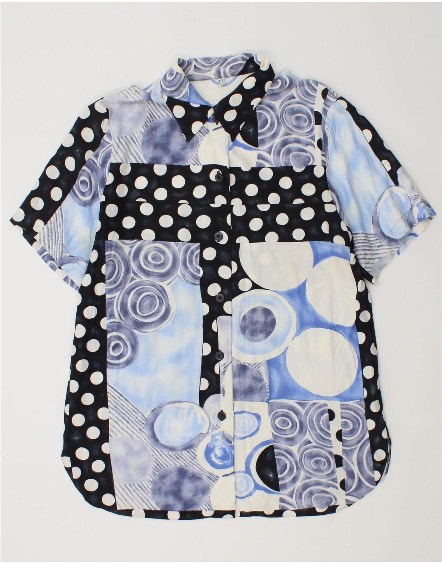 Vintage kvinders kortærmet skjortebluse UK 14 Large Blue Patchwork Viscose