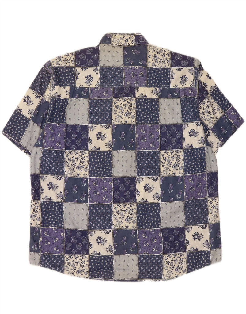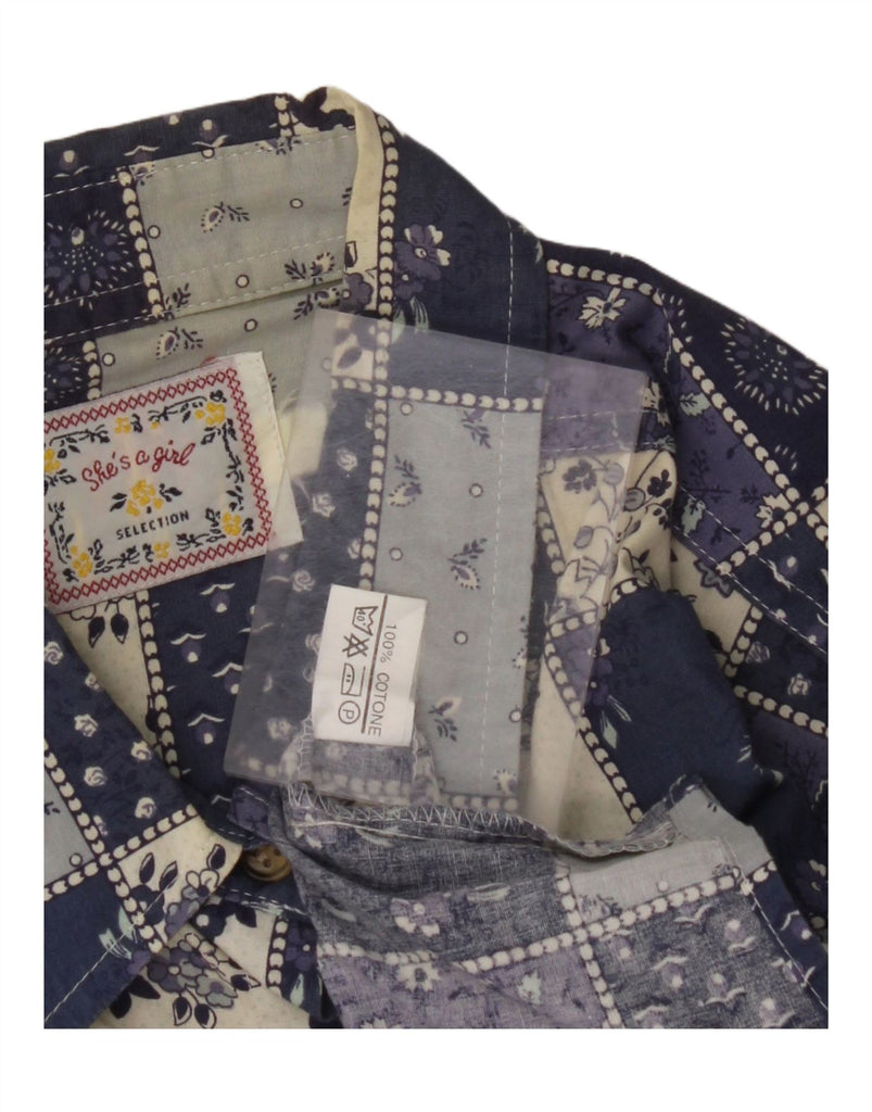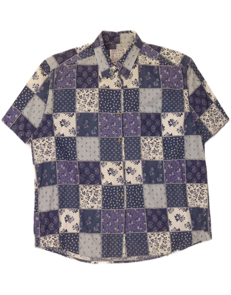 VINTAGE kortærmet skjorte til kvinder UK 20 2XL Blå Patchwork Bomuld