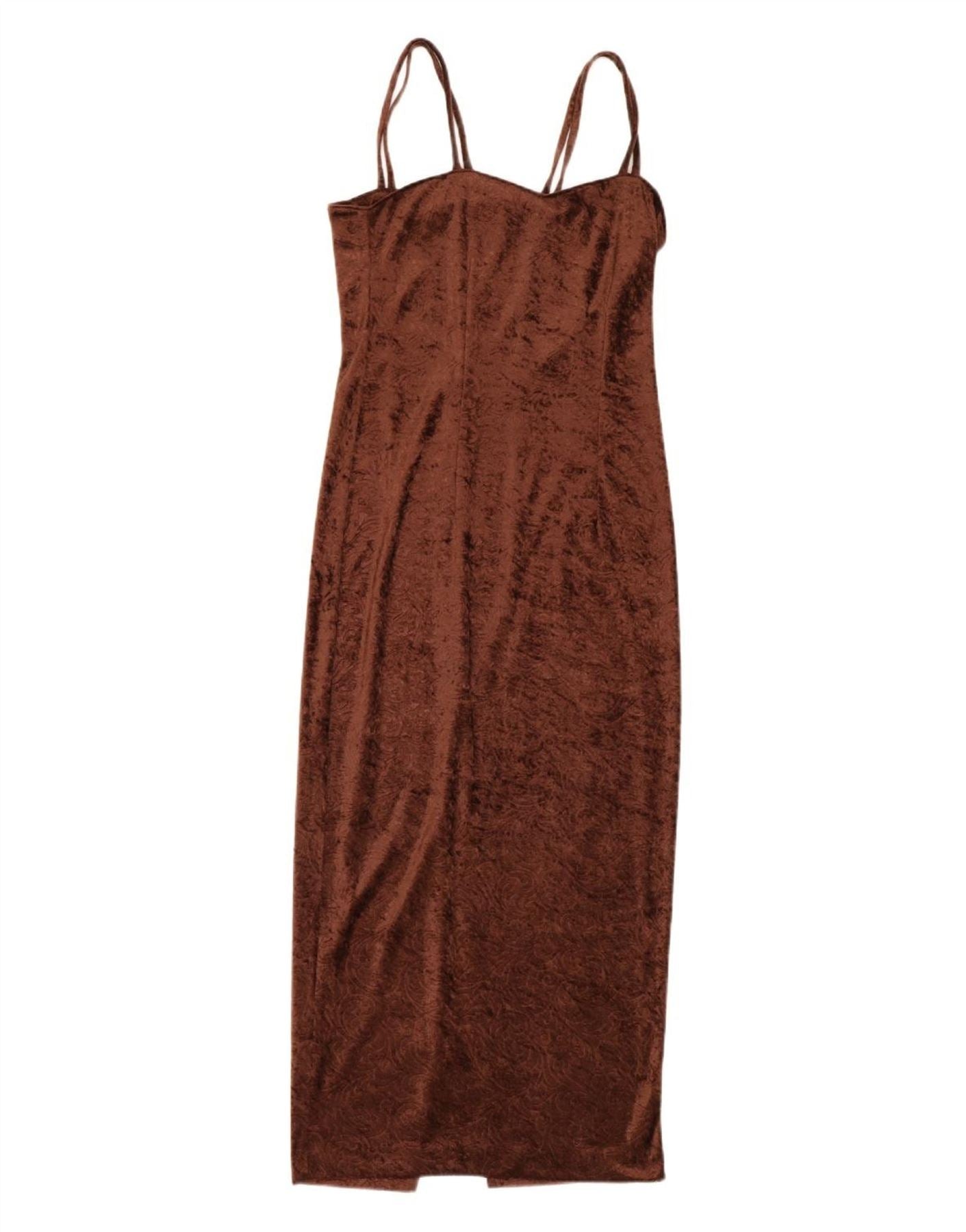 AI beskrivelse: Dette originale Natalie Maxikjole og Bolero sæt til kvinder er lavet af luksuriøst rigt brunt fløjl. Den ærmeløse maxikjole har en flatterende V-udskæring og fine stropper. Dens slanke pasform skummer elegant figuren og tilbyder en sofistikeret silhuet. Den medfølgende bolero-jakke har lange ærmer, der giver elegant dækning. Begge dele er foret og tilbyder behagelig stretch. Dette sæt udstråler tidløs 90'er glamour.