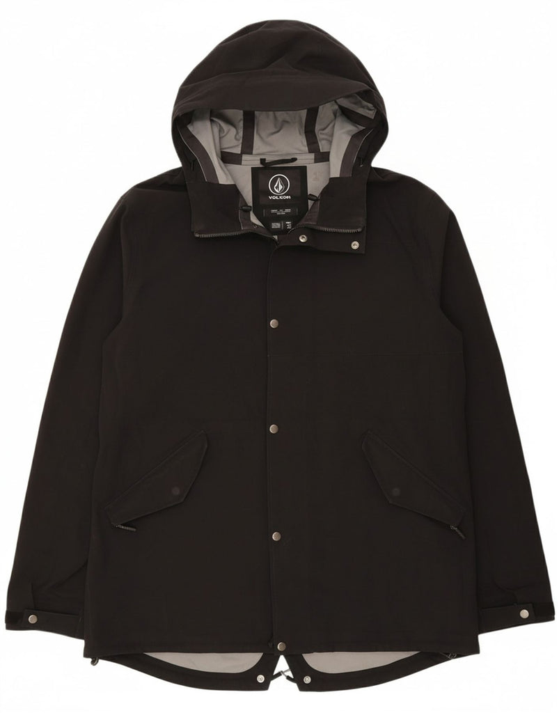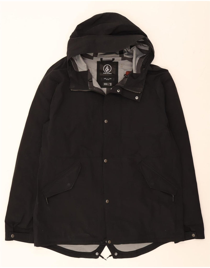 - AI Description: This Volcom mens waterproof jacket is crafted from durable black woven fabric. Its smooth finish offers essential protection. The practical hooded design and high neck provide excellent coverage, complemented by long sleeves with comfortable cuffs. A full zip closure ensures ease of wear, whilst multiple pockets add functional detailing. This breathable jacket, in a regular fit, is ideal for sports and outdoor activities.