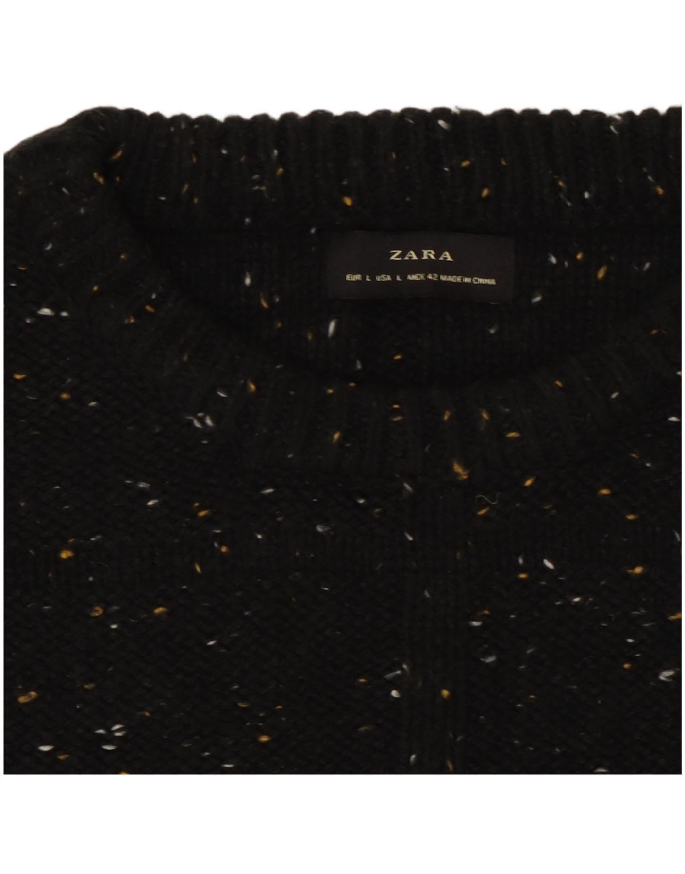 - AI beskrivelse: Denne Zara sweater med rund hals til mænd er lavet af et behageligt sort strikstof. Den har et karakteristisk plettet mønster hele vejen igennem, hvilket tilføjer visuel interesse. Den klassiske runde halsudskæring og lange ærmer giver en tidløs silhuet. Dens pullover-design sikrer let at bære. En normal pasform giver en behagelig hverdagsstyling.
