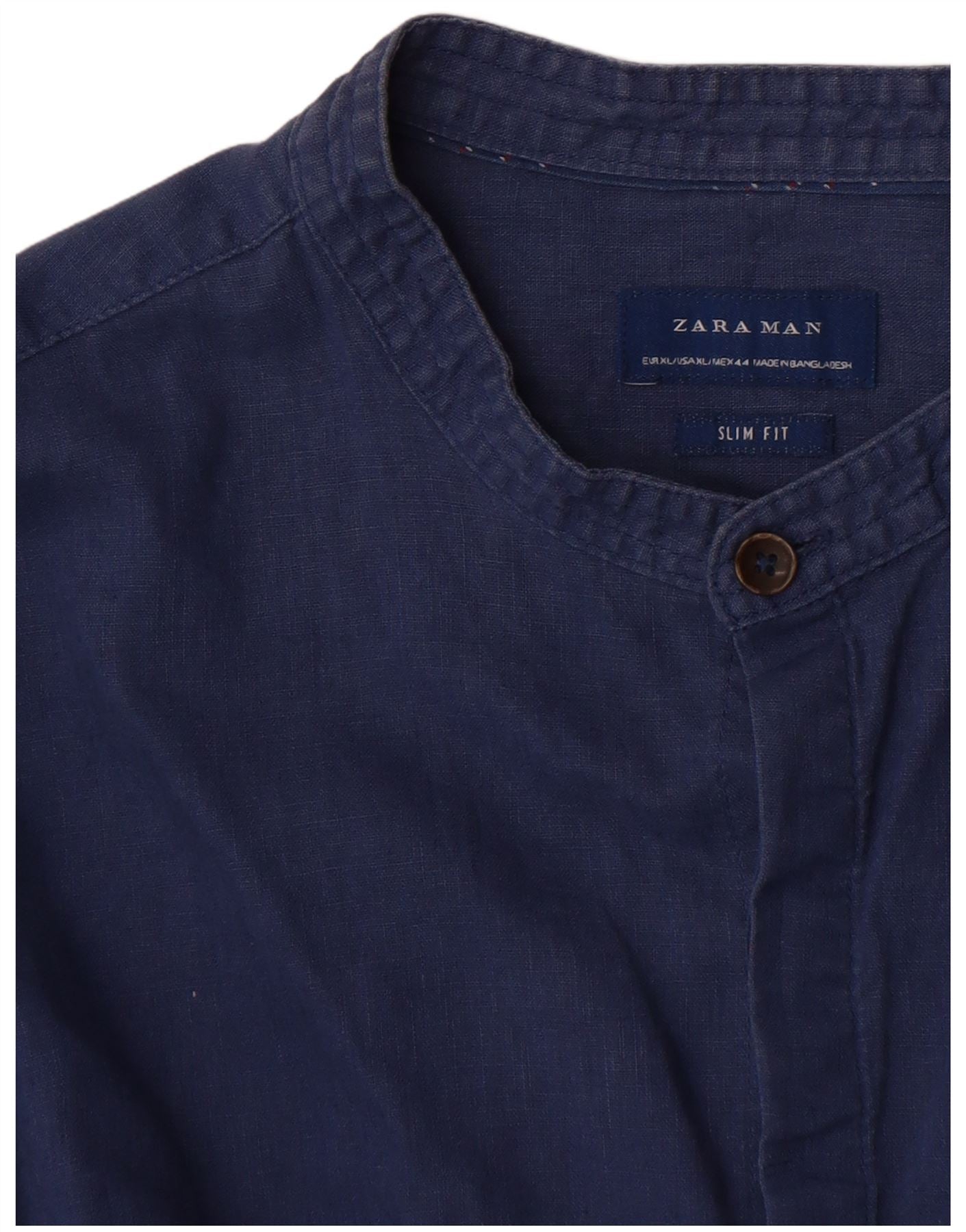 - AI beskrivelse: Denne Zara herreskjorte er lavet af et let marineblåt vævet stof. Den har en moderne båndkrave og en fuld knap foran. Lange ærmer afsluttes med pæne manchetter med knapper. Det almindelige design suppleres af tonale knapper. Dens slanke pasform tilbyder en moderne silhuet, ideel til smart fritidstøj.