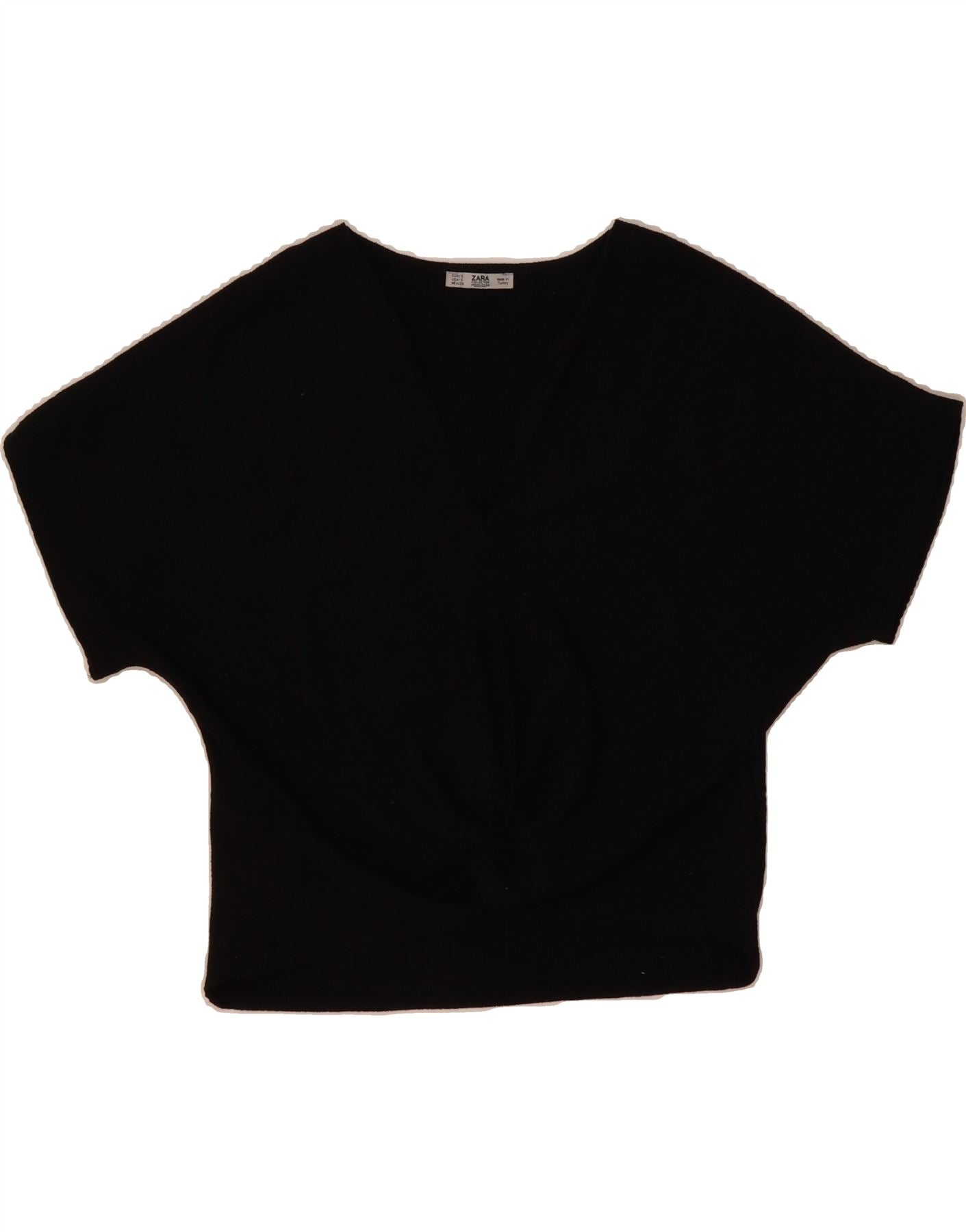 - AI Description: This Zara women's T-shirt top is a classic staple piece. In excellent pre-owned condition, this black knit top features a round neck and short sleeves. The regular fit and cropped length make it a stylish addition to any wardrobe. Garment has minor loose stitching at the bottom and collar. Label size S. Made in Turkey with a pullover closure.