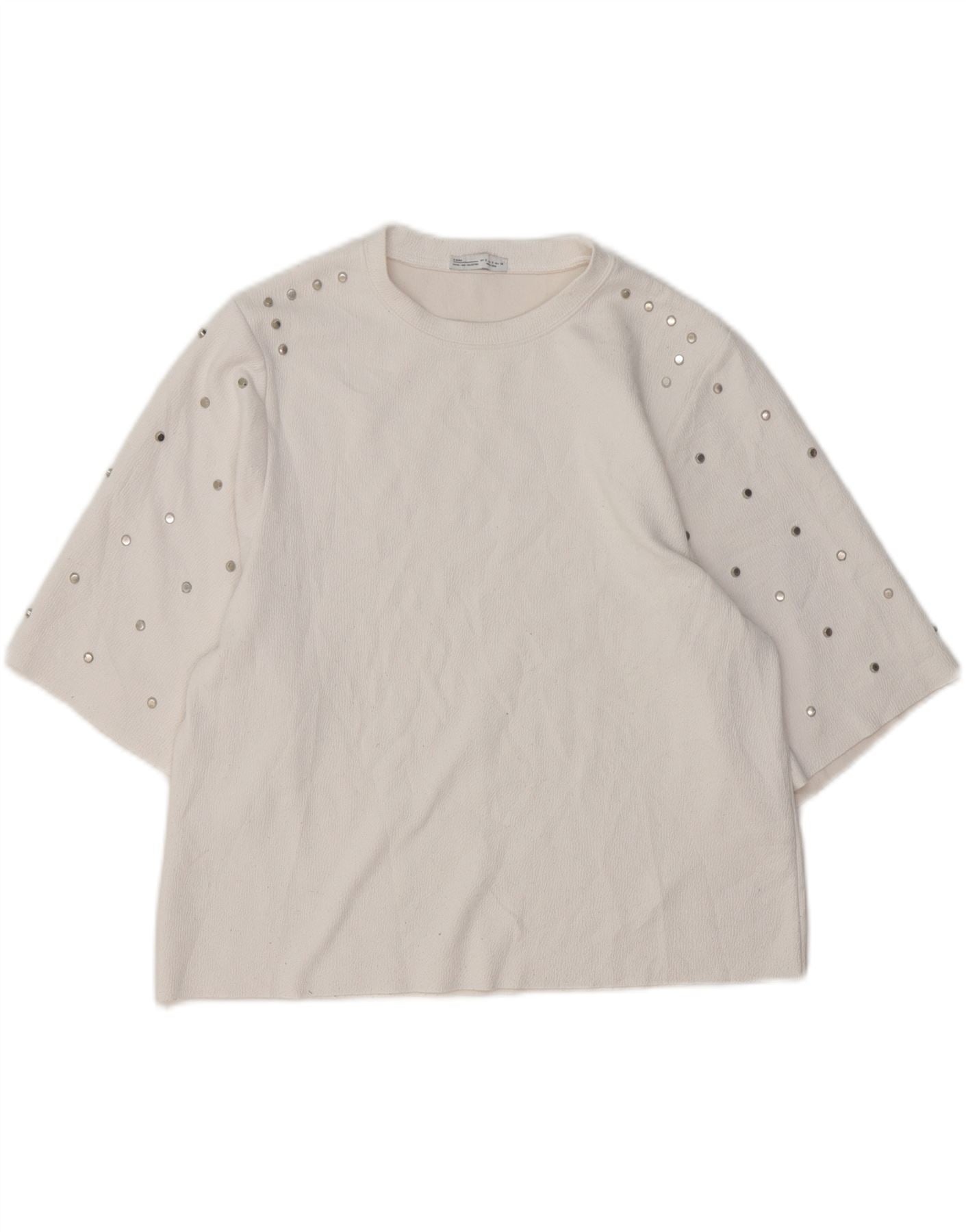 - AI beskrivelse: Denne Zara T-shirttop for kvinder er lavet af et råhvidt tekstureret jerseystof. Den har en klassisk rund halsudskæring og korte ærmer. Sølvtonede nitter pryder ærmerne og tilføjer en moderne accent. Den beskårede længde giver en moderne silhuet. Dens regelmæssige pasform sikrer behageligt slid.