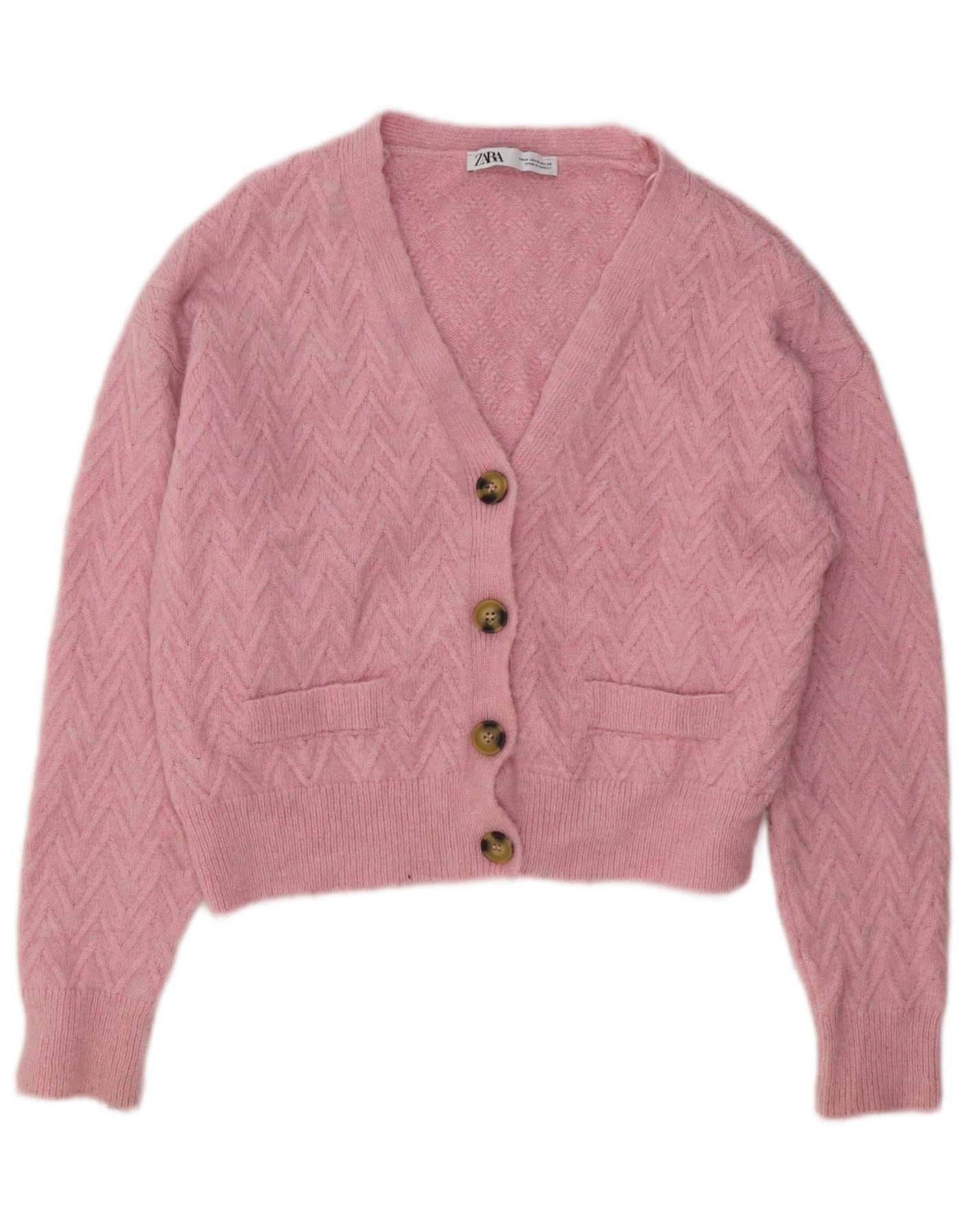 ZARA Womens Crop Cardigan Sweater UK 14 Medium Pink Chevron Acryl