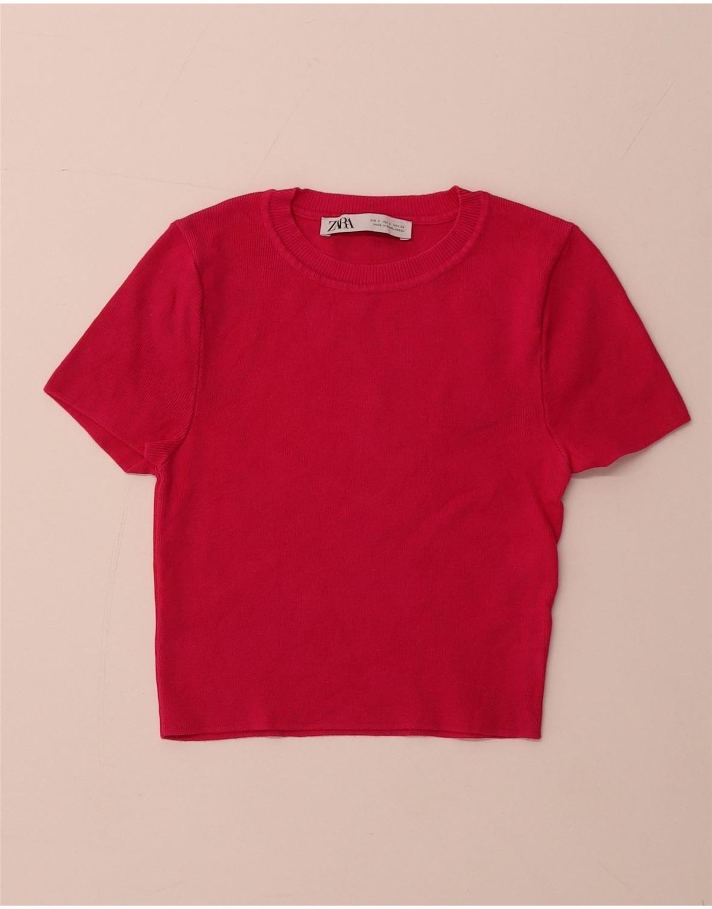 ZARA Womens Crop Kortærmet Jumper Sweater med rund hals UK 8 Small Pink