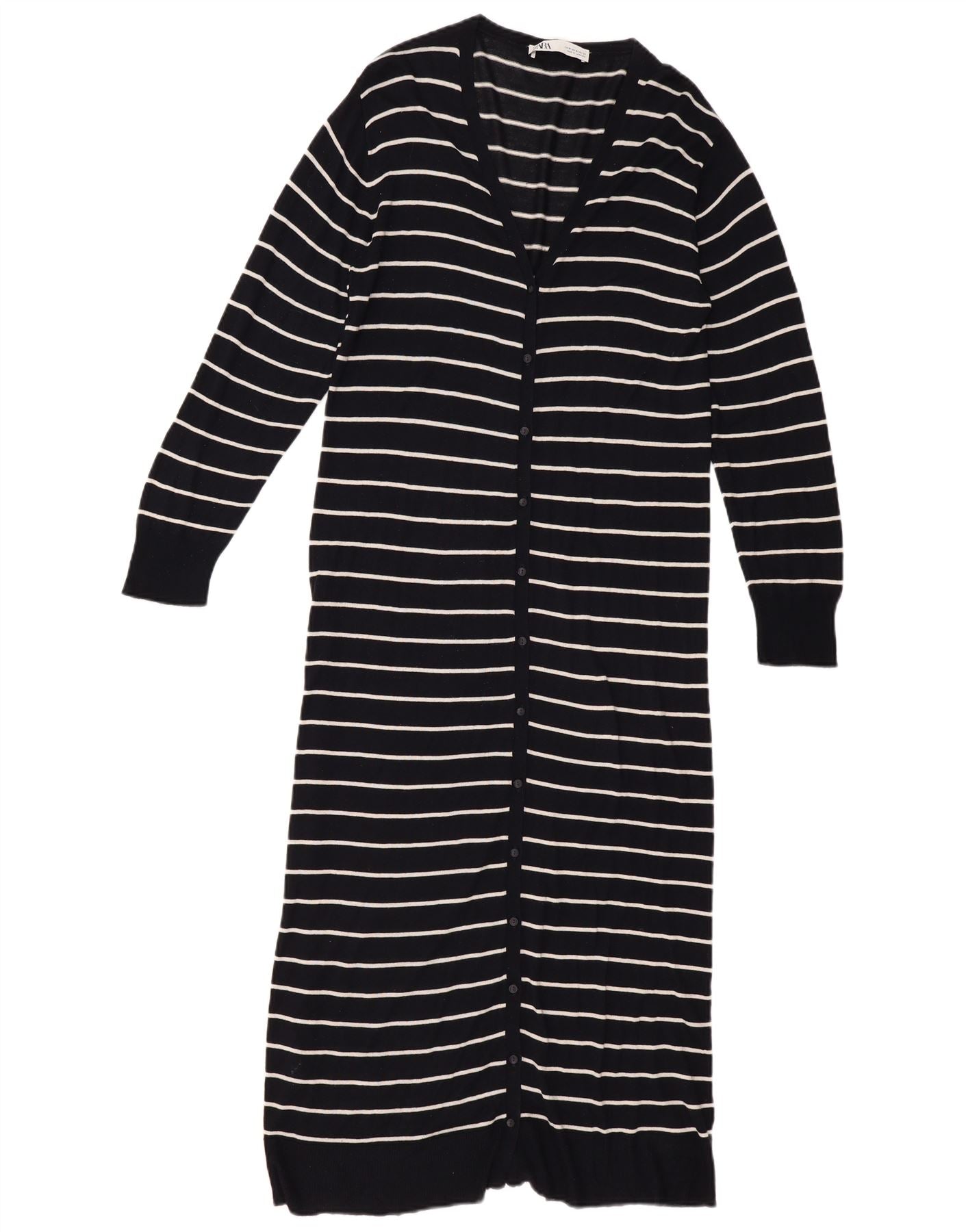 Zara Dame Longline Cardigan Sweater UK 14 Medium Sort Stribet Viscose