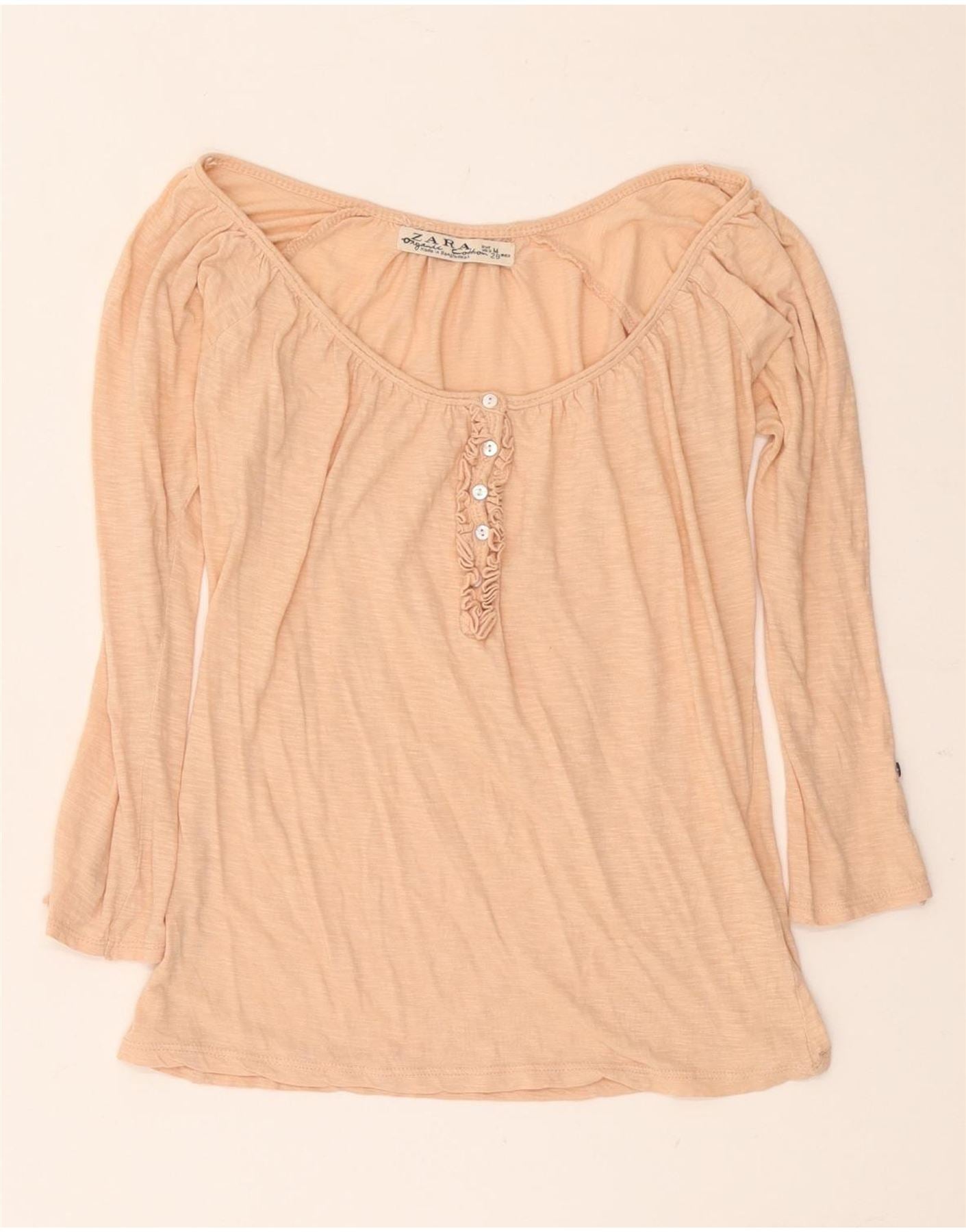 - AI beskrivelse: Denne Zara T-shirttop for kvinder er lavet af blød økologisk bomuldsjersey i en blid beige nuance. Den har en klassisk Henley-udskæring med en knap foran. Lange ærmer og en afslappet pasform sikrer behageligt slid. Subtile knapdetaljer ved halsudskæringen tilføjer et raffineret touch. Det åndbare stof tilbyder hverdagskomfort og en alsidig stil.